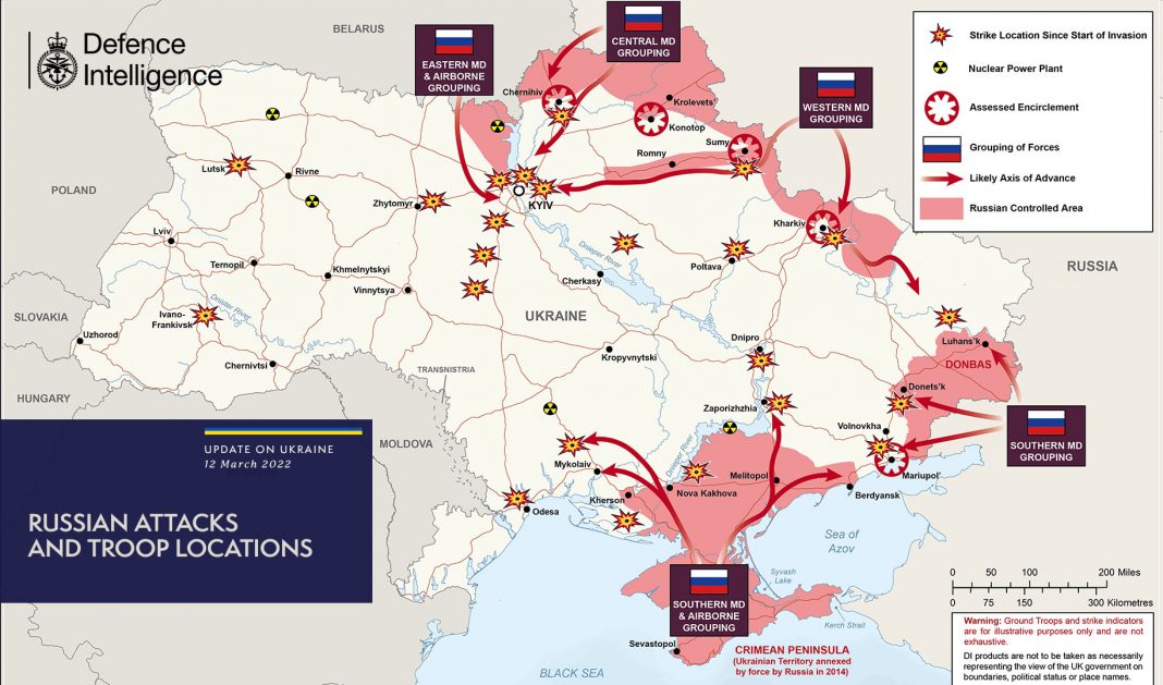 Der Twitter Kanal des britischen Verteidigungsministeriums veröffentlicht jeden Tag eine Karte des aktuellen russischen Vormarsches sowie des wahrscheinlichsten weiteren Vorgehens der russischen Truppen (siehe Grafik). Hinzu kommen Hintergrundinformationen über weitere nachrichtendienstliche Erkenntnisse. Dies ist der offizielle Twitter-Kanal:https://twitter.com/DefenceHQ