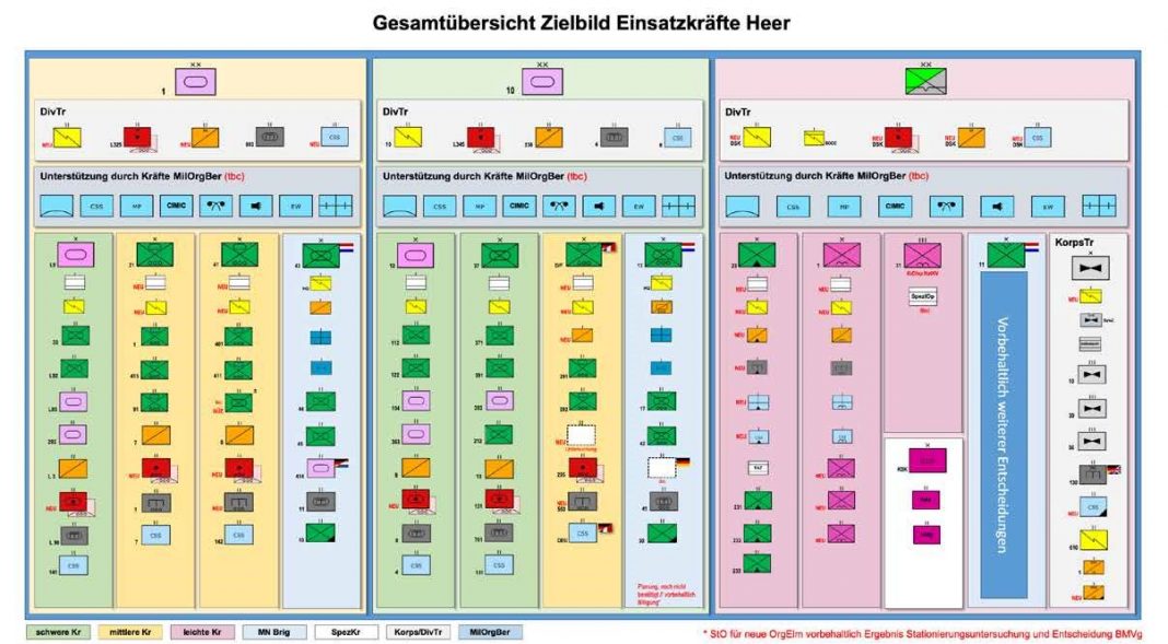 „Das im Heer entwickelte Zielbild für die Einsatzkräfte des Heeres sieht drei Divisionen mit Divisionstruppen mit acht nationalen Brigaden in einem kohäsiven Verbund vor, die grundsätzlich querschnittlich bis in die Verbandsebene kaltstartfähig für die Landes- und Bündnisverteidigung gegliedert und ausgestattet werden sollen. Dabei gilt es, in einem ersten Schritt zunächst drei schwere Brigaden (PzBrig 12, PzGrenBrig 37 und dann PzLehrBrig 9) als einsatzbereites Kräftedispositiv für die Einmeldung in die NATO-Verpflichtungen und die Reaktionsfähigkeit im Rahmen LV/BV vorzuhalten und den Startschuss für die Implementierung der neuen Fähigkeiten mittlerer Kräfte in einem Brigadeverbund zu setzen“, beschreibt die Broschüre. „Mit Billigung des Zielbildes durch das BMVg haben die Planungen zur Anpassung der Truppenstrukturen in einer ersten Phase in enger Abstimmung des Kdo H mit dem AHEntwg begonnen. Die hier entwickelten Grobstrukturanpassungen sollen mit zeitlich nachgestaffelter Entwicklung von Feinstrukturen zeitnah anzupassender Einzelelemente bis Ende des Jahres abgeschlossen sein und dann, vorbehaltlich der Billigung durch das BMVg, 2023 sukzessive in die Umsetzung gehen.“