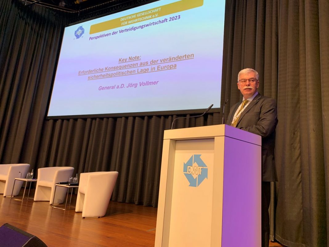 Beim DWT-Symposium „Perspektiven der Verteidigungswirtschaft“ beschrieb der Strategic Advisor des Behörden Spiegel, General a.D. Jörg Vollmer, die Neuausrichtung der NATO und deren Implikationen auf die Bundeswehr. „Der Paradigmenwechsel liegt darin, dass ein verbindlicher Plan und fest zugeordnete Kräfte existieren“, sagte General a.D. Vollmer. Dies seien die 400.000 Soldatinnen und Soldaten, die durch den NATO-Generalsekretär mehrfach erwähnt wurden. „Jetzt sind diese Kräfte wieder verbindlich einzumelden.“