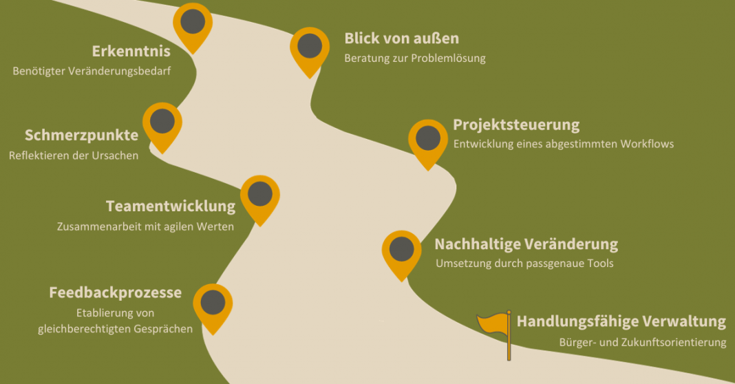 In einem interaktiven Workshop mit allen Beteiligten versucht die Beratung, mithilfe von innovativen Methoden die Gründe für die Überlastung und das fehlende Gefühl von Teamzusammenhalt zu erkennen. Im Workshop kommt ans Licht, dass die Abteilung von vielen Veränderungsprozessen überrollt wurde, die „von oben“ delegiert wurden und die Mitarbeitenden stark einspannt. Dadurch fehlt die Zeit für Austausch und Abstimmung darüber, wer welche Aufgaben gegebenenfalls schneller erledigen könnte. Aufbauend auf den Ergebnissen entscheiden sich die Teams, sich auf zwei Aspekte zu konzentrieren: die Steuerung der Projekte und den Aufbau von prozessorientierten Teams im Sinne einer agilen Verwaltung.