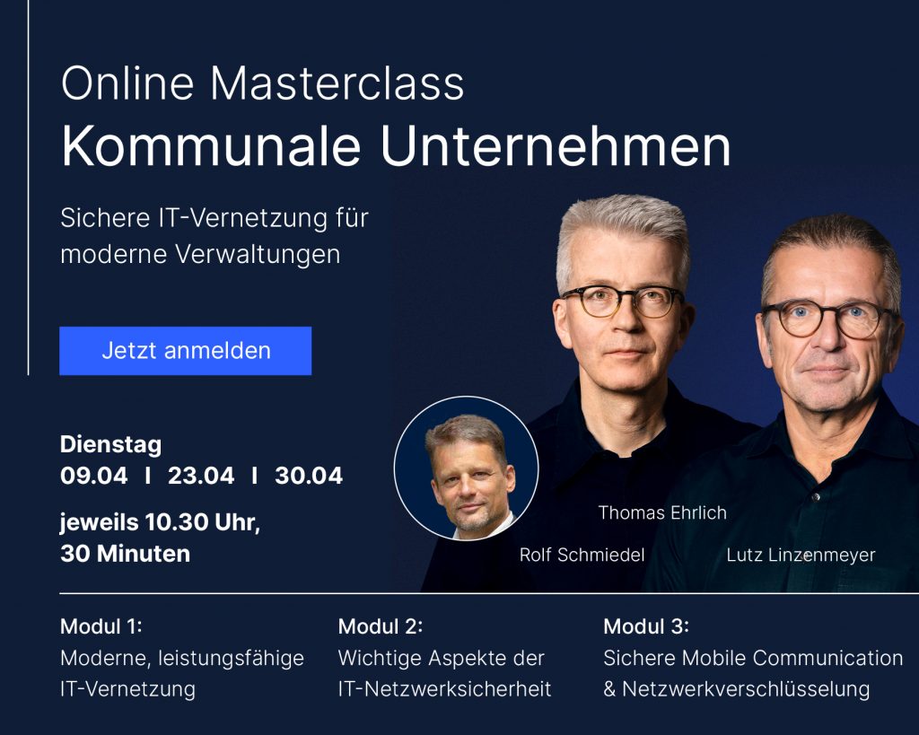 In der digitalen Ära stehen kommunale Unternehmen vor der Herausforderung, eine leistungsfähige IT-Infrastruktur aufzubauen, die sowohl sicher als auch zukunftsfähig ist. Diese MasterClass bietet praxisnahe Lösungen für (1) die Entwicklung einer modernen IT-Vernetzung, (2) Schlüsselelemente der IT-Netzwerksicherheit im Einklang mit NIS-2-Anforderungen, und (3) Sicherheitsstrategien für mobile Kommunikation und Netzwerkverschlüsselung.
