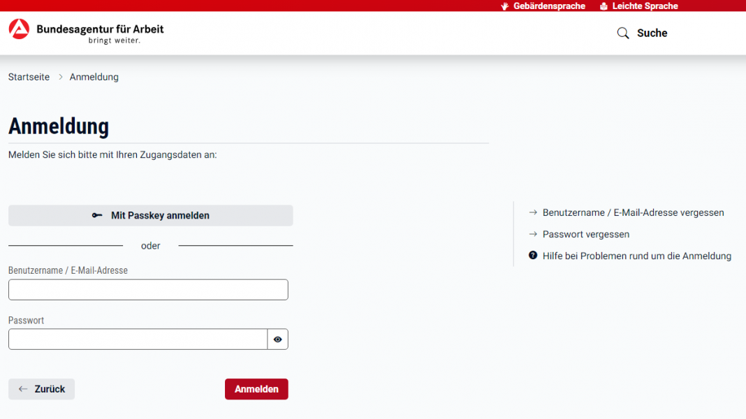 Nach wie vor können sich Nutzer des Online-Portals über ihren Benutzernamen und Passwort einloggen. Zusätzlich besteht die Möglichkeit, sich über die BundID anzumelden. Die BA selbst empfiehlt die Anmeldung über die BundID oder Passkeys, da diese Wege besonders sicher und „zukunftsgerichtet“ seien.