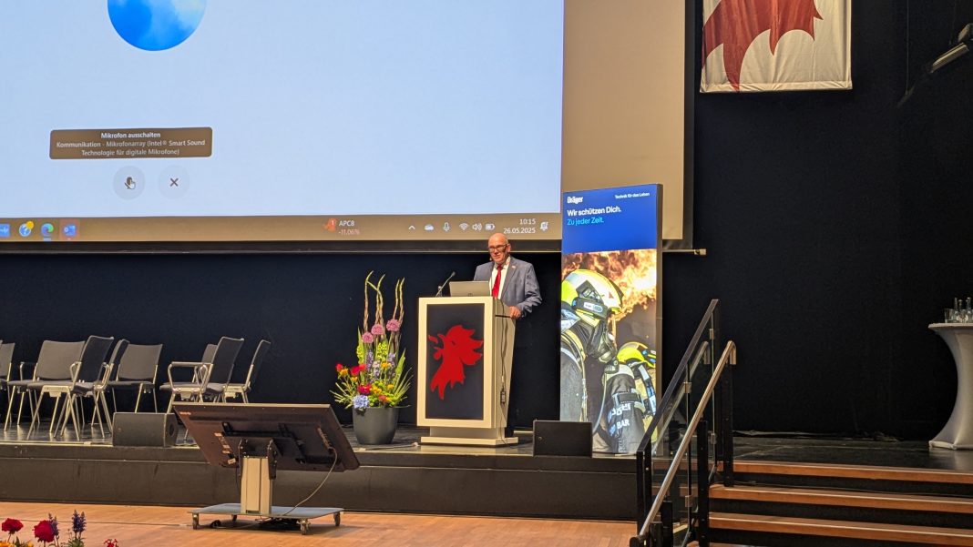 Mehr als eine Spielerei: vfdb-Präsident Dirk Aschenbrenner eröffnete die Tagung gemeinsam mit seiner KI-Assistentin Dora. Mit diesem Mensch-Maschine-Dialog wollte er die Bedeutung von KI unterstreichen – und zeigen, dass ihr Einsatz längst keine Zukunftsvision mehr ist.