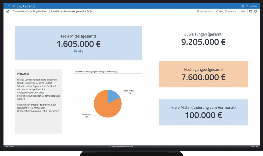Moderne Plattformen wie disy Cadenza führen diese Datenquellen zusammen, visualisieren sie übersichtlich und stellen Zusammenhänge her. So wird sichtbar, wo Ressourcen knapp werden, welche Bereiche personell unterbesetzt sind oder wie sich Budgetverschiebungen konkret auswirken – und das alles auf Knopfdruck.