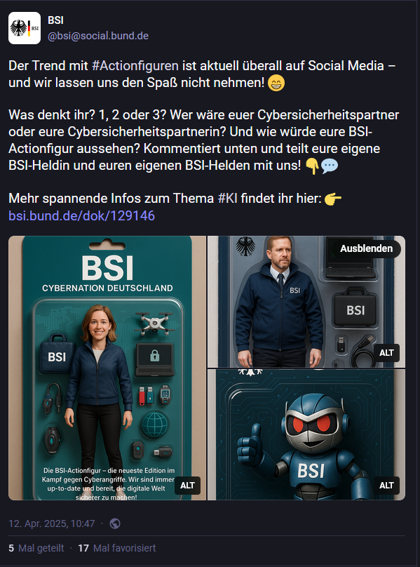 Das BSI ist dabei umfangreich auf den einzelnen Netzwerken vertreten. Es bespielt LinkedIn, Mastodon, Bluesky, YouTube, Instagram und XING mit Inhalten. Nach eigener Aussage benutzt das Bundesamt Social Media, um „zielgruppengerecht, verständlich und aktuell über Cybersicherheit zu informieren“. Das Interesse an den Inhalten ist dabei groß. Allein auf LinkedIn folgen dem BSI etwa 236.000 Nutzende, auf Instagram sind es noch knapp 25.000. Das BSI setzt dabei auch auf Kooperationskampagnen. So produzierte die Behörde im März dieses Jahres mit zwei YouTubern sogenannte „Challenges“, welche umfangreich auf YouTube ausgespielt wurden. Die Themen waren dabei z. B. die Vertrauensprüfung von Online-Shops während des Surfens auf einer (echten) Welle oder die Einrichtung eines Gast-WLANs, während einer der YouTuber ein „zwiebelreiches“ Essen anrichtet. Damit möchte das BSI auf humorvolle Weise die Relevanz von Cyber Security vermitteln und nutzt dafür auch die Reichweite bekannter Social-Media-Akteure, um neue Zielgruppen zu erreichen. Das ist aber nicht das einzig kreative Projekt. So macht die Cyber-Sicherheitsbehörde auch Trends wie die Erstellung einer ChatGPT-Actionfigur mit oder stellt BSI-Präsidentin Claudia Plattner 24 kurze Fragen jenseits von Cyber Security.