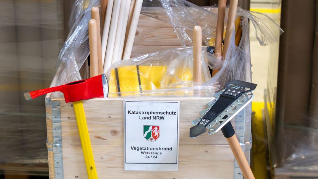 Während des Hochwassers 2021 im Ahrtal fehlte es teilweise an Geräten und Ausrüstung, um schnell helfen zu können, so das Innenministerium in Düsseldorf. Im neuen Lager stehen Hilfsmittel bereit, die nach Einsatzzweck sortiert sind, zum Beispiel Pumpen, Kettensägen, Zelte, Schutzkleidung und vieles mehr. Sie sind auf Paletten verpackt und können schnell auf LKW verladen und zur Einsatzstelle gebracht werden. Die Städte und Kreise in Nordrhein-Westfalen können die Sachen anfordern, wenn Bedarf ist und ihre eigenen Mittel nicht ausreichen. Die Anforderung läuft über die jeweilige Leitstelle.