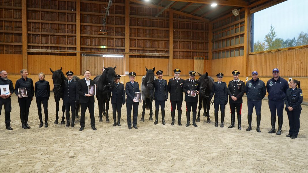 „Die Pferde haben die Halle betreten“ – mit diesen Worten begann die Taufe der vier italienischen Murgesen. Die überwiegend schwarzen Hengste traten ruhig in die Stahnsdorfer Reithalle der Bundespolizei, während die anwesenden Polizistinnen und Polizisten sowie Carabinieri sie aufmerksam und gespannt begrüßten.