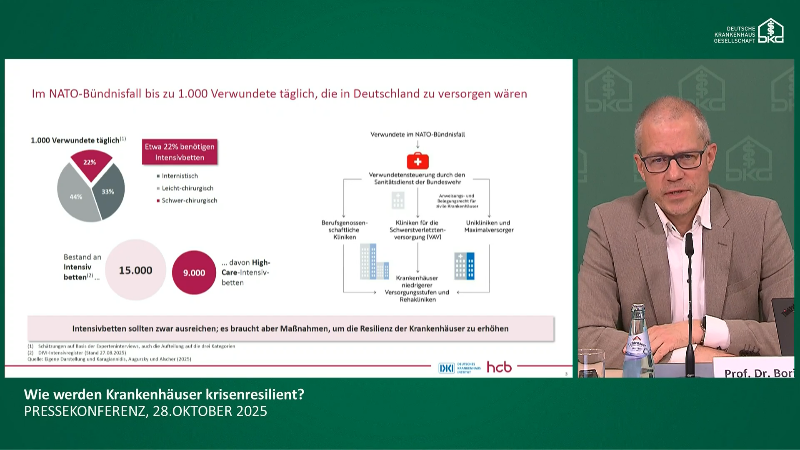 Das deutsche Gesundheitssystem ist schon im Normalbetrieb unter Stress. Wie es einer Krisenlage aussieht, kann man schwer abschätzen. Gerade ein Bündnis- oder Landesverteidigungsfall ist der ultimative Belastungstest. Deshalb müssen Krankenhäuser jetzt fit gemacht werden. Das fordert die Deutsche Krankenhausgesellschaft (DKG). In einem Gutachten hat sie errechnen lassen, wie teuer eine resiliente Krankenhausgesellschaft sein wird.